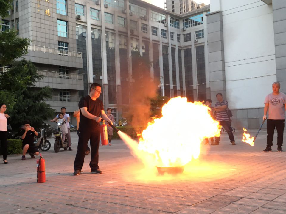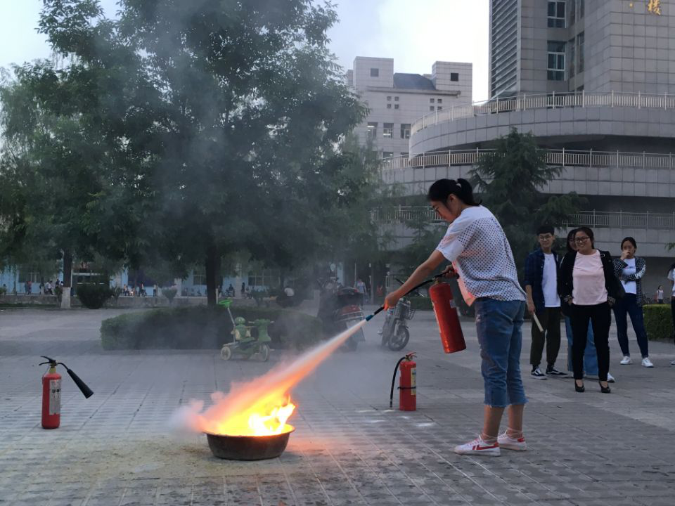 随后,张科长向全体人员讲解了消防安全知识,重点说明了消防“四懂四会”的主要内容以及灭火器的种类和使用方法。讲解结束后,张科长与消防科工作人员模拟火灾现场,为同学们现场演示灭火操作。师生们也踊跃参与现场灭火演练,熟练掌握灭火器的使用方法。