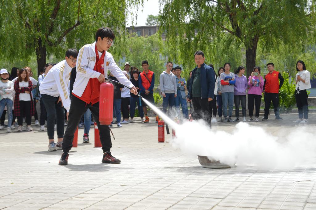 随后,崔哲老师向全体人员讲解了消防安全知识,重点说明了消防灭火器的种类和使用方法。讲解结束后,崔哲老师与消防科工作人员模拟火灾现场,为同学们现场进行了干粉灭火器和二氧化碳灭火器灭火操作演示。演示结束后,同学们也踊跃参与现场灭火演练,积极掌握灭火器的使用方法。