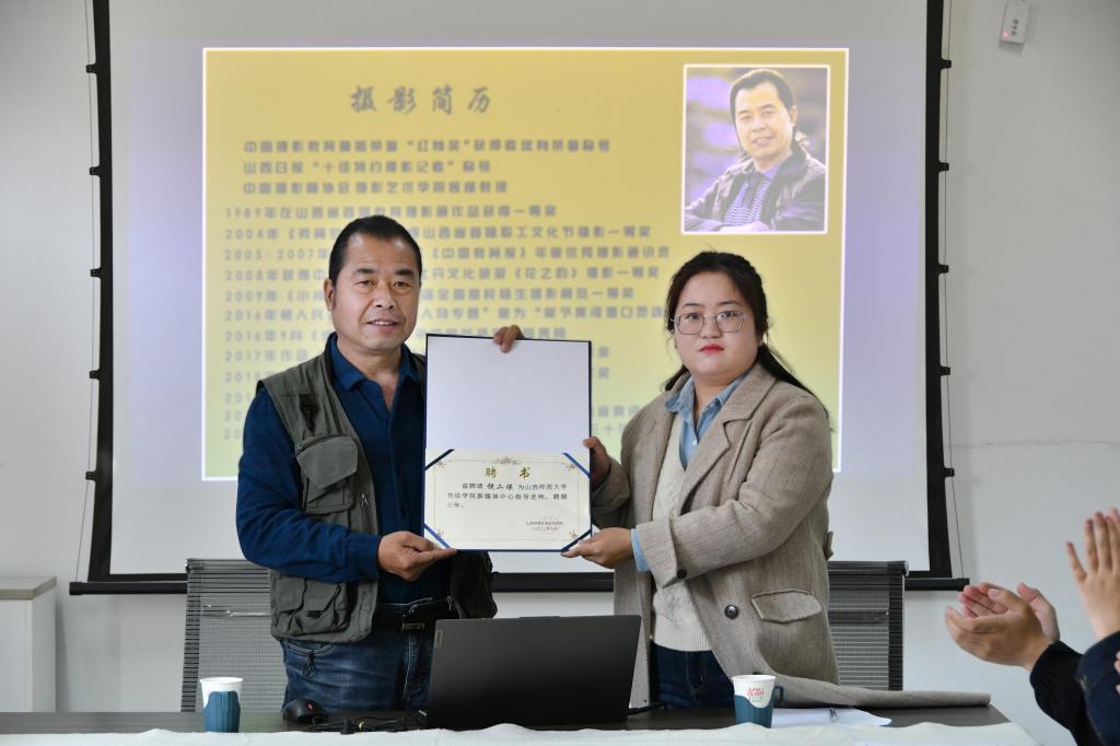 讲座开始前,宁译锐代表emc易倍新媒体中心向饶二保老师颁发了聘书,聘请饶二保老师为emc易倍新媒体中心指导老师。