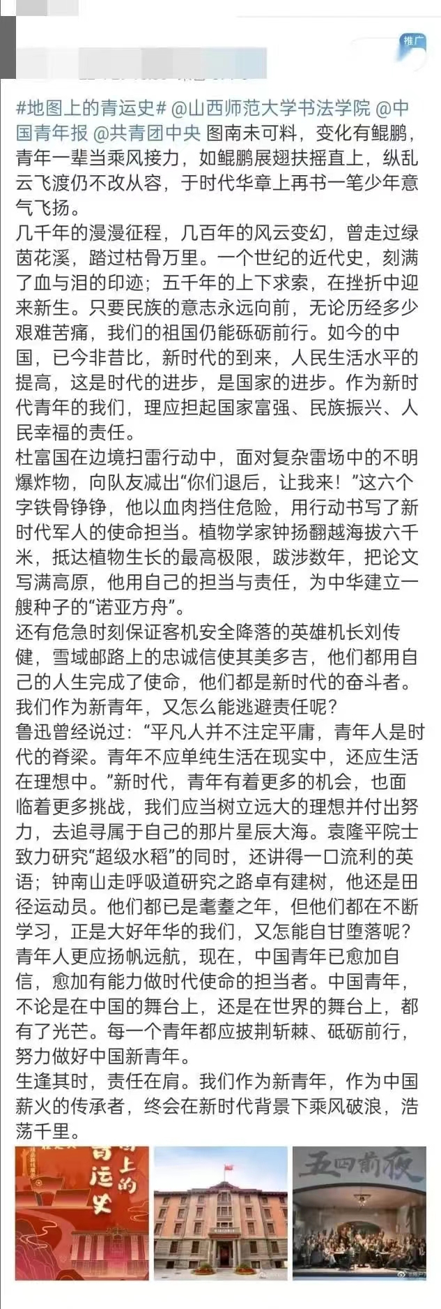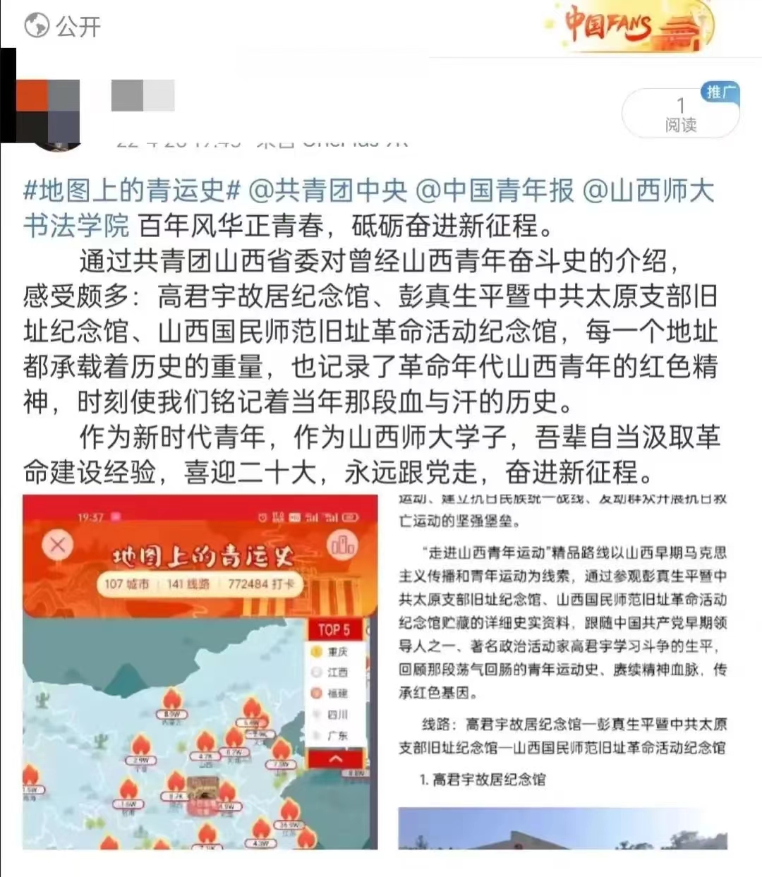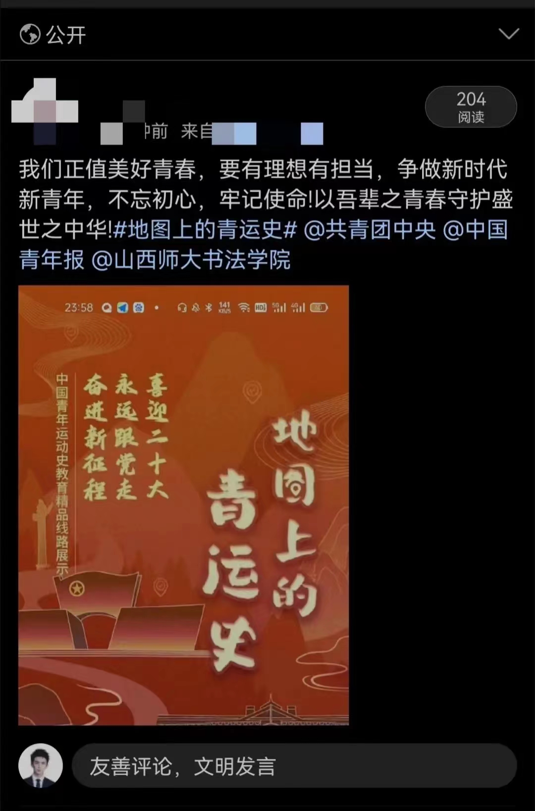 地图上的青运史,记录着革命先烈们每一个勇毅前行的足迹,饱含了奋斗的艰辛和革命岁月的激情澎湃。在本次活动中,同学们以接力打卡的形式,通过带话题#地图上的青运史#发微博进行互动,并@共青团中央@中国青年报@emc易倍,跟随先辈们的步伐,以线上形式回望共青团过去百年奋斗历程,感受过去一代代青年人的英勇与奉献。