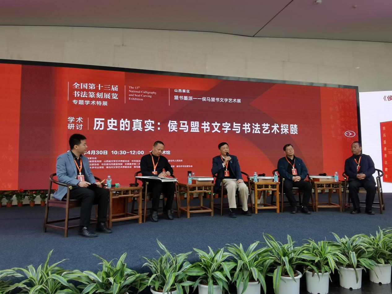 开幕式后,还举行了“历史的真实:侯马盟书文字与书法艺术探赜”学术研讨会。中国古文字研究会会长吴振武、湖南大学岳麓书院教授陈松长、中国书法家协会副主席叶培贵、山西省书协副主席高智,分别围绕侯马盟书的发现及在文字演变过程中的作用、侯马盟书的书法特征及审美价值、侯马盟书对当代书法创作的影响等议题展开了深入研讨。吴振武认为侯马盟书在中国古文字史上占有重要地位,并对侯马盟书中重要的文字问题予以解读;陈松长从《曾侯乙》楚简与侯马盟书的异同出发,阐述了六国书体之间的互通性和侯马盟书的重要价值;叶培贵从书写的本体出发,认为盟书书法产生的基础是毛笔的物理特点和右手执笔书写的生理特点,艺术审美化也会促使人们发现毛笔运动的其他可能性,使早期字迹在重新进入艺术场域时,也会被全新的笔墨所改变。高智对于侯马盟书的出土挖掘作了详细介绍,并对盟辞类例进行了举例说明。在研讨会提问互动环节,专家学者对于“侯马盟书书法创作用字”“简牍与盟书的风格”“盟书文字入印”等问题给予了深度剖析,观点引发听众共鸣,现场掌声不断,气氛热烈。