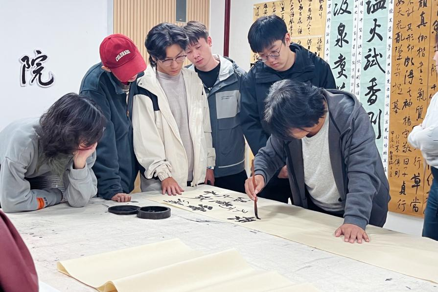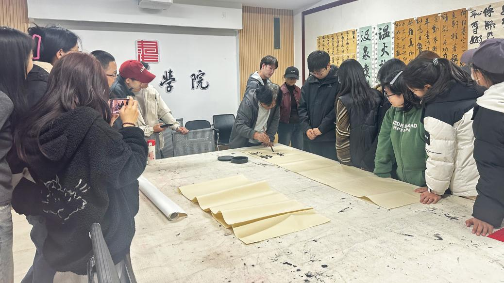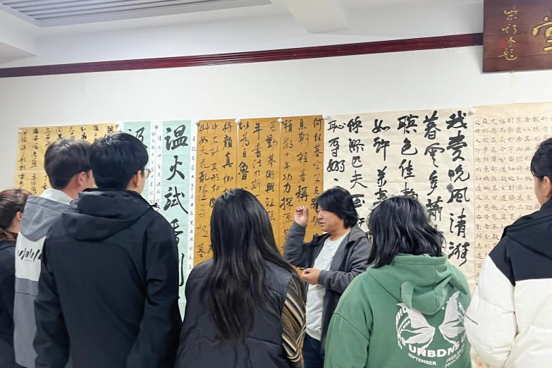 在书法交流活动中,王老师对每位同学的作品进行了细致入微的点评,将作品从章法到墨法、笔法进行了逐一指导,重点强调了作品在细节上的处理,要求在临摹和创作的过程中,了解该字帖在结字、用笔上的主要特征,从而把握整体风貌,并通过示范的形式,具体演示了如何去把握所学字帖的面貌特征。随后,王老师对同学们每次及时修正作品问题的行为表示肯定,鼓励同学们在日常学习过程中加强沟通交流,彼此借鉴启发,共同进步。