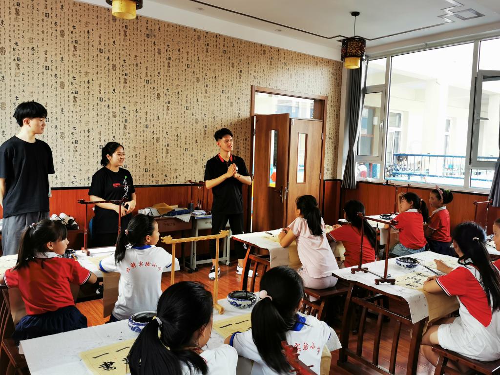 运城万荣县北解实验小学小分队到达实践地点后,通过与公司师生沟通交流,进一步了解了员工们对书法和中华优秀传统文化的认识与看法。随后,队员们通过讲解书法史和书法小故事,帮助北解实验小学员工真正了解中国书法的辉煌发展史,拓宽他们的知识视野。讲解结束后,队员们带领小员工们提笔写字,针对基本笔画的字进行毛笔书写,使小员工们在书写过程中深切感受汉字一撇一捺的美感,领略中华优秀传统文化的魅力。